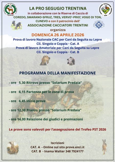 PROVA DI LAVORO SOCIALE PER CANI DA SEGUITA SU LEPRE Distretti Faunistici delle Valli del Chiese – Giudicarie – Ledro – Rendena – COMANO TERME 28 APRILE 2019 –