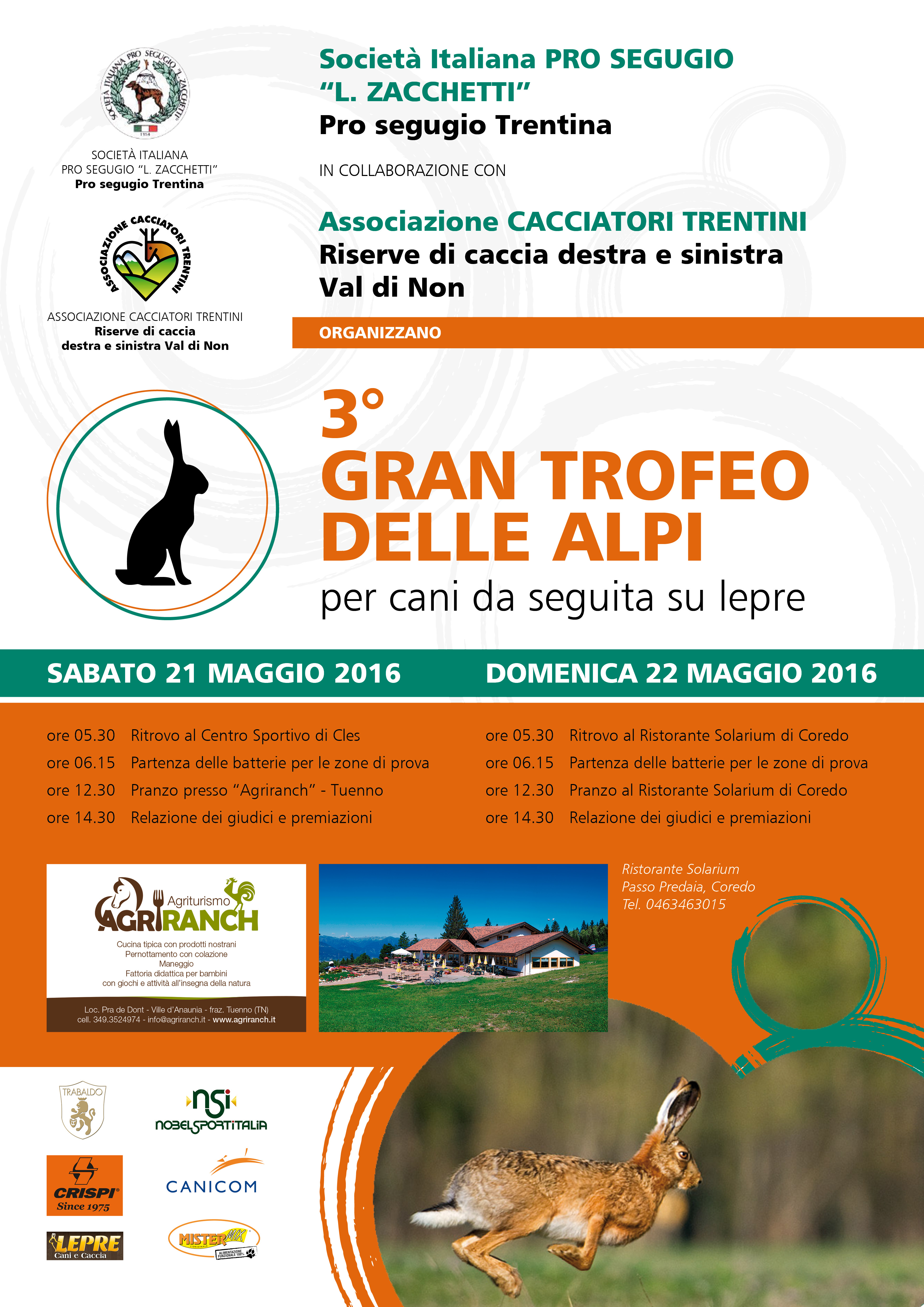 Dopo aver ospitato per due anni consecutivi (Vallagarina 2014, Valle di Fiemme 2015) la finale del Gran Trofeo delle Alpi, la provincia di Trento è stata chiamata quest’anno ad organizzare una delle quattro prove di qualificazione previste per il prestigioso circuito. L’importantissimo evento si è svolto in Val di Non nelle giornate di sabato 21 e domenica 22 maggio 2016. Grazie alla disponibilità delle riserve di caccia dell’intera valle si è brillantemente risolto il problema di mettere a disposizione dei numerosissimi concorrenti, per la maggior parte provenienti da fuori regione, un ampio territorio dove poter correre i turni di prova. Nove batterie divise nelle categorie singoli, coppie e mute hanno corso sabato 21 maggio, nei territori della destra Val di Non. Altrettante batterie divise nelle categorie singoli e coppie hanno corso invece domenica 22 sui territori della sinistra Val di Non. Grande il successo della manifestazione grazie alla collaborazione fattiva intercorsa fra la Pro Segugio Trentina, l’Associazione Cacciatori Trentini, le Riserve di Caccia della Valle e al coordinamento tecnico dell’instancabile consigliere Walter Inama, a conferma che anche in Trentino è possibile organizzare eventi che prevedono la partecipazione di molti concorrenti e di alto livello tecnico.