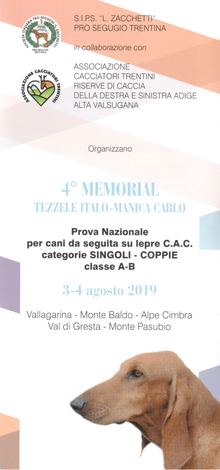 luglio 23, 2019Due splendide giornate di sole e i territori del Trentino meridionale hanno fatto da cornice, nei giorni 3 e 4 agosto 2019, alla 4^ edizione del MEMORIAL TEZZELE ITALO – MANICA CARLO, Prova Nazionale per cani da seguita su lepre, Classi Singoli e Coppie, Cat. A – B, manifestazione a cadenza biennale in ricordo di 2 soci segugisti della Riserva di Caccia di Villa Lagarina.